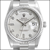 ロレックスの腕時計においては、デイト(日付)が表示されているモデルのほかに、曜日を表すデイ機能が搭載されているものが存在しており、これら両方の機能を備えている腕時計は「デイデイト」と称され、ロレックスの腕時計の中で最も高く位置づけされている腕時計である。 なお、日付をまたぐ瞬間に瞬時に日付がめくれる機能をデイトジャスト機能といい、かつてはこの機能が備わっているモデルのみをデイトジャストと呼んでいたのだが、デイトジャスト機能がほぼすべてのモデルに搭載されるようになってしまった現在においては、デイトジャストという名称はモデル名としての意味しか持たないようになってしまった。 腕時計の用語一覧に→戻る |